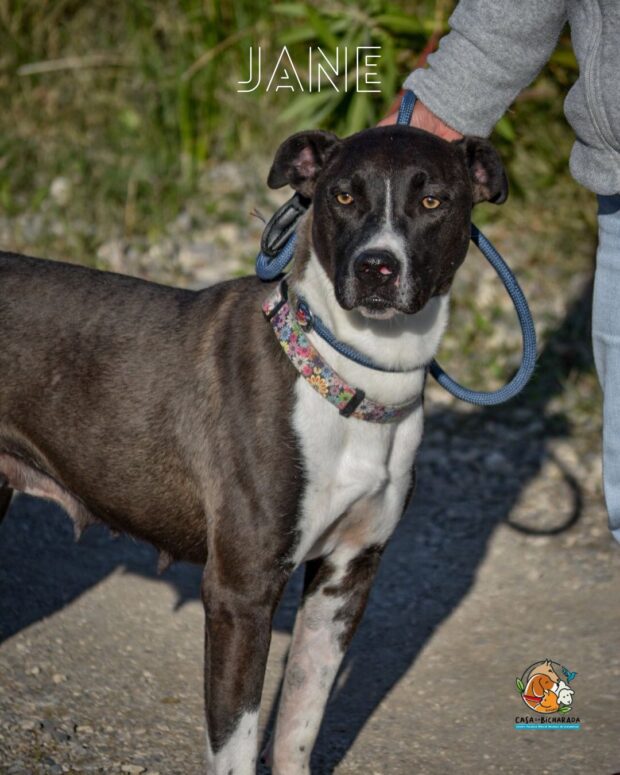 É uma patuda ativa, que adora longos passeios. Dá-se bem com todos os humanos, outros patudos nem tanto. A Jane procura uma família que tenha muito amor para dar.